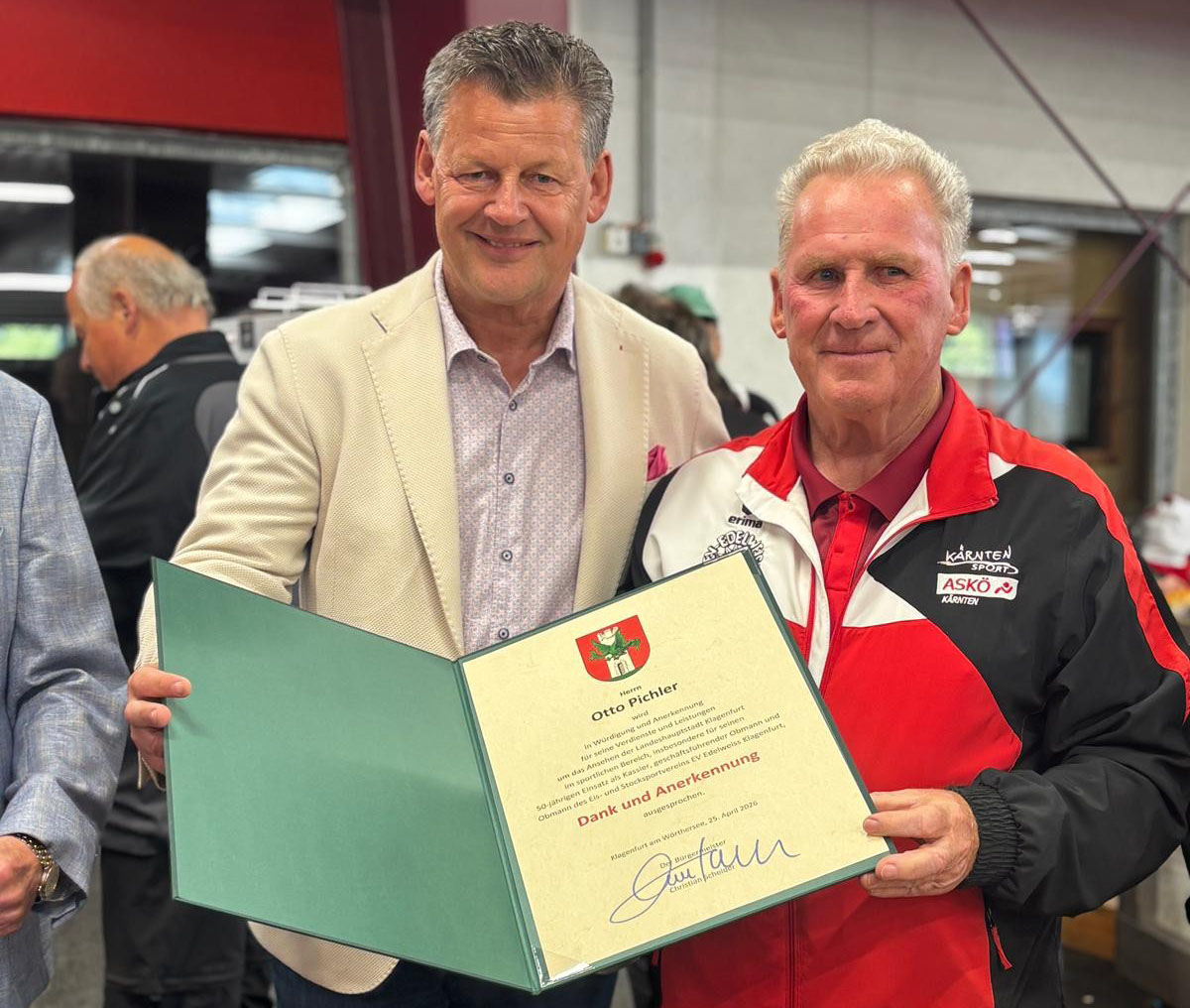 „Ein Verein lebt nicht nur mit seinen Mitgliedern, sondern sehr stark vom persönlichen Einsatz seiner Funktionäre. Otto Pichler ist ein Aushängeschild im Vereinsgeschehen der Stadt, er wirkt bereits ein halbes Jahrhundert in unterschiedlichen Funktionen für den EV Edelweiss. Dafür gebührt ihm höchste Anerkennung und Wertschätzung“, so Bürgermeister Christian Scheider. Anlässlich der Jubiläumsfeier im Rahmen eines Vereinsturniers bei der Stocksportanlage Klagenfurt gratulierte Scheider dem langjährigen Obmann des Eis- und Stocksportvereins Edelweiss und überreichte ihm die „Dank und Anerkennung“-Urkunde.